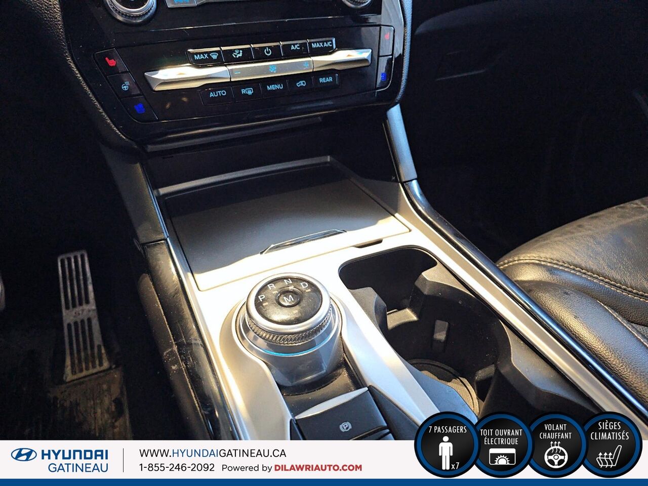 console au plancher pleine grandeur avec compartiment de rangement couvert, miniconsole au pavillon avec compartiment de rangement, 3 prises de courant de 12 v c.c. et 1 prise de courant intérieure de 120 vca